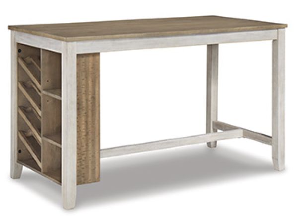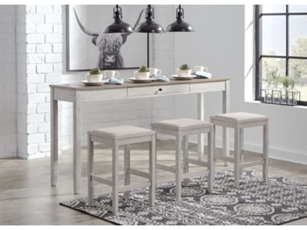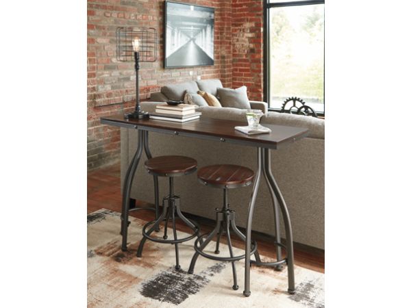 Made with select acacia veneers and hardwood solids. Gently distressed and burnished dark brown finish. D594-35 has a planked table design with thick-look tops and butterfly leaf. Seat covers in brown faux leather. D594-32 counter table features a self-storing butterfly leaf that extends from 42" X 60" to 42" X 78". |