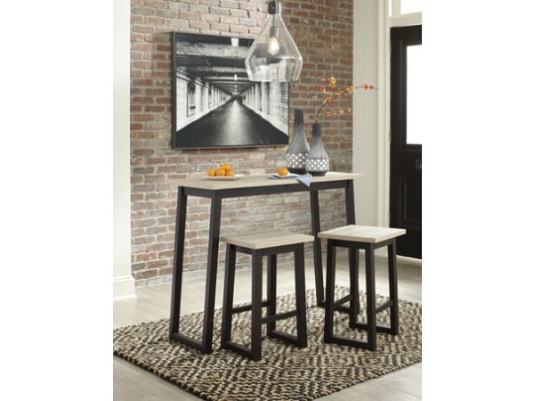 This clever counter height table and bar stool set invites you to raise the bar on small space living. An inspired choice for coastal chic or modern farmhouse settings, this clean-lined, simply striking set doubles the charm with brown tone plank effect tops, paired with grayish white bases with rub through effect for timeworn appeal. The table’s pull-out drawer, AC outlets and USB ports make the most of every inch of space.