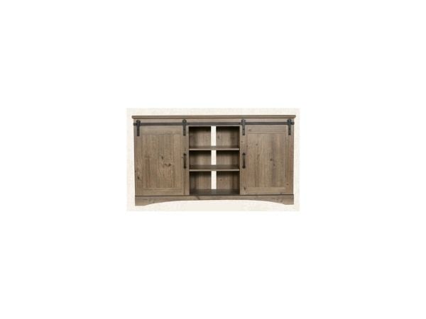 Give your living area an instant refresh with the addition of the Americana Modern 63-inch TV Console with Power Center. A tastefully designed media option, it features closed storage, glass doors for media components, and a fresh cotton white finish accented with a contrasting wood-grain top and metal hardware.