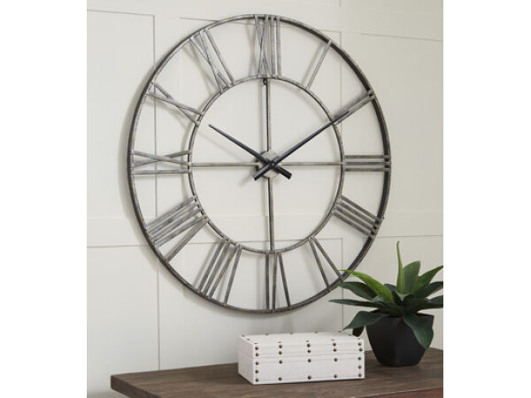 Turn back the hands of time with this wall clock. Large Roman numerals pop against the distressed cream finish to exude the timeworn splendor we cherish.