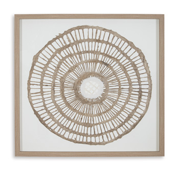 Brown finished framed wall sculpture. Geometric design in brown paper under acrylic. D-ring bracket for hanging. Due to the use of natural materials ,some variations may occur. |
