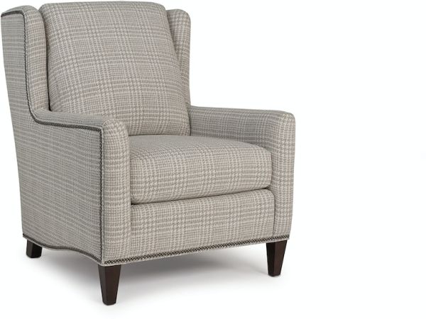 Accent chair. Wingback and tight seat cushion. Upholstered in dune polyester Next-Gen Nuvella fabric. Accent legs in brown finish. |