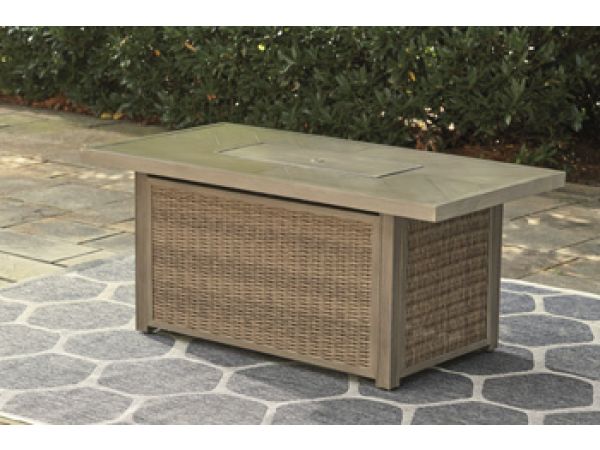 Turn your backyard space into your own piece of paradise with this outdoor fire pit table. Though this outdoor table looks remarkably like wood, it’s made of sturdy, rust-proof aluminum that’s perfectly suited for al fresco living. Enhancing the rustically refined aesthetic: side panels accented with all-weather, handwoven resin wicker. The result may look high maintenance, but rest assured, this outdoor piece is anything but. With the press of a button, ignite a flickering flame that dances over a bed of glass beads. And with room for four, it’s one highly accommodating outdoor fire pit table.