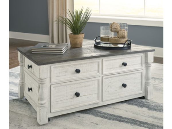 Casual farmhouse design. Made with Pine solids and veneer with engineered wood substrate. Two-tone finish scheme with distressed weathered gray tops on a vintage white cases. The lift-top cocktail table features four storage drawers ,two large drawers on front and two smaller drawers on the sides. A small concealed storage tray under the lift-top for seldom used items. Square end table with a drawer and lower open shelf. A small flip-lid located on the top of the chairside door cabinet conceals a 110V power supply with 2 USB charging ports for conveniently charging your devices. |
