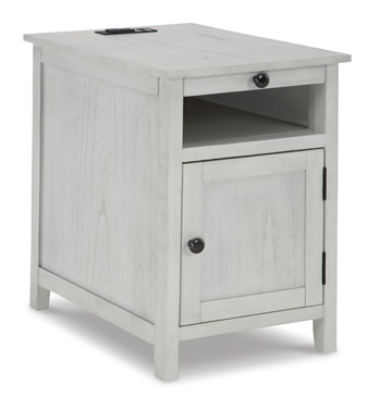Add big character to a small space with this chairside end table. With its compact size and strong silhouette, it can go anywhere and blend easily into the decor. Less is so much more with the Shaker-inspired design and whitewashed wood grain finish. Loaded with form and function, this end table displays accent pieces and stores essentials securely while keeping devices powered up.