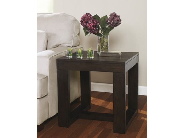 This designer end table makes it hip to be square. Bold, blocky profile is enriched with plank-effect styling and a textured grayish brown finish for a look that’s cool and contemporary and a vibe that’s warm and inviting.