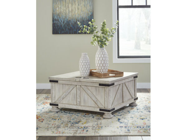 Rustic Farmhouse design. Made with pine solids and veneers with engineered wood substrate. Distressed whitewashed finish. Stylish cross-buck details and metal bracket appliques. Dual lids on the cocktail table are designed for easy access to the large capacity storage area. |